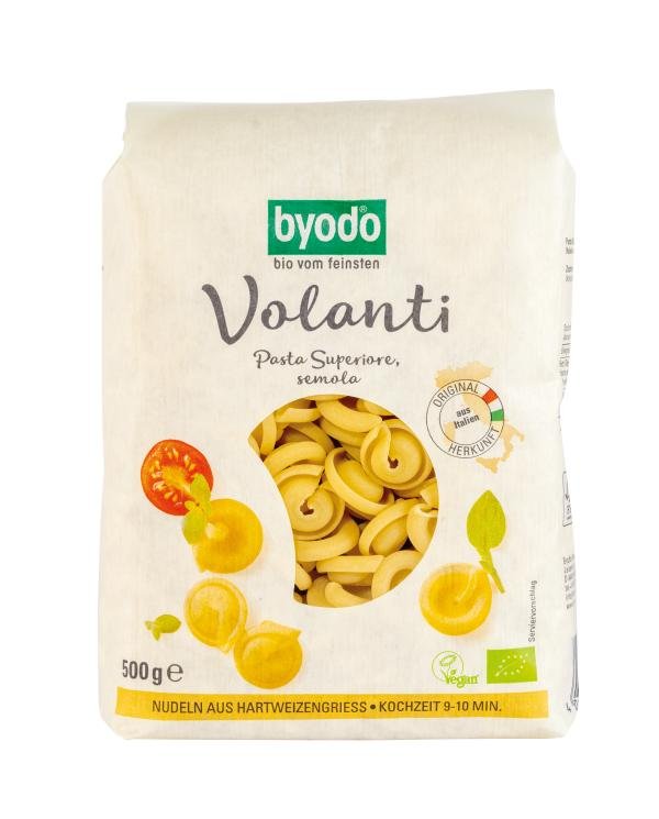 Die Volanti, semola von Byodo werden aus feinstem italienischen Bio-Hartweizengrieß hergestellt. Die originelle Form überzeugt mit einem schönen Biss.
