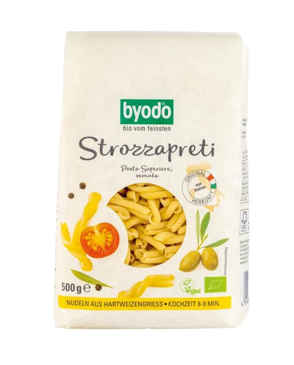 Die Byodo Strozzapreti, semola aus 100% biologischem Hartweizengrieß sind mit ihrem perfekten "al-dente"-Biss ein herrlicher Genuss. Traditionell werden sie in Kombination mit Gemüsesaucen oder klassischem Ragout genossen.