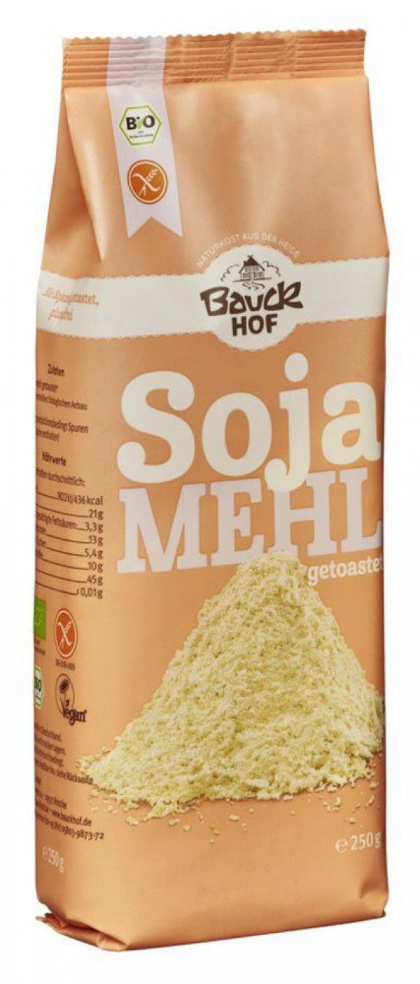 Bauckhof Sojamehl jetzt in getoasteter Qualität. Das Sojamehl muß nun nicht mehr vor dem Verzehr erhitzt werden. Verwendbar zum Backen, zum Kochen, für Süßspeisen, als Eiersatz.