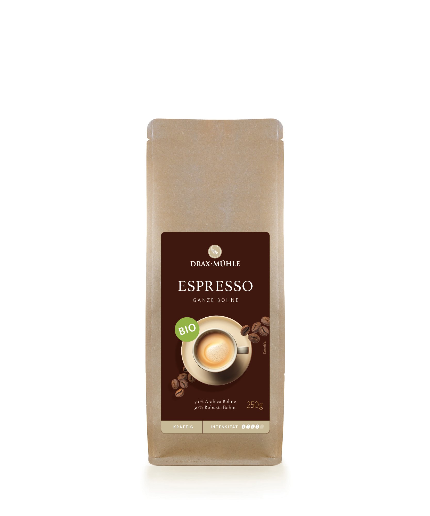 Aus kontrolliert biologischem Anbau. 70% Arabica Bohne, 30% Robusta Bohne